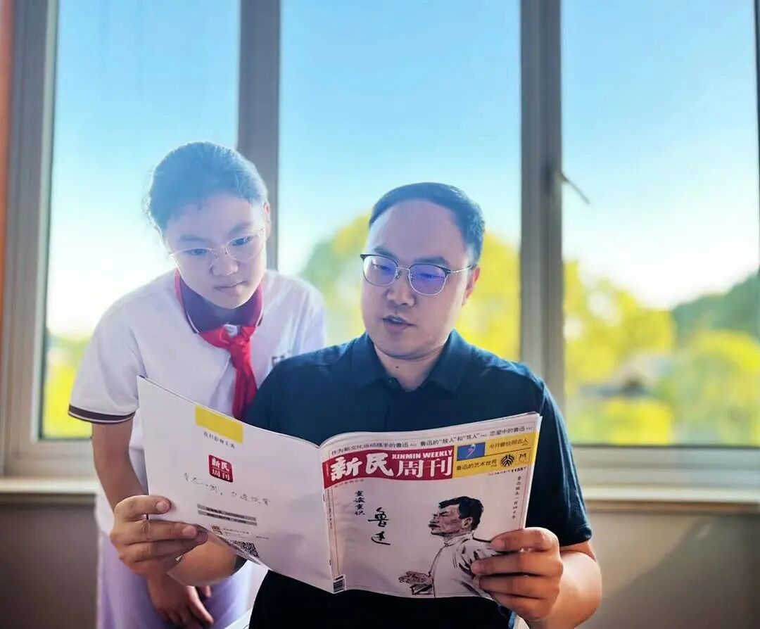 ▲刘佳怡和父亲刘俊一起品读主题为纪念鲁迅先生一百四十周年诞辰的《新民周刊》