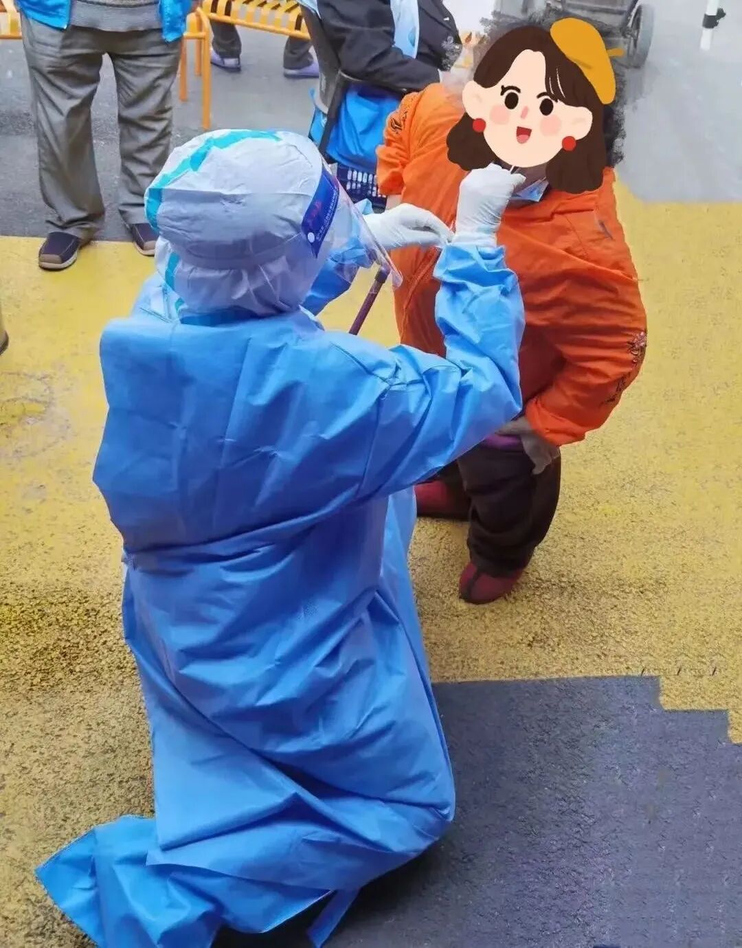 3月13日,一张医护人员单膝跪地为一名身患残疾的居民做核酸采样的照片,在微信群里流传。