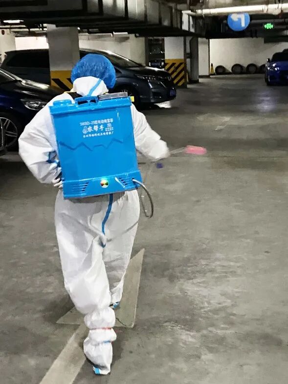 天还未亮时,蔡志萍就要开始一天的工作。消杀器械重达几十斤,身形较小的她背起器械后,只能微佝着腰吃力地前行。但即便如此,她依旧一丝不苟地对公共区域进行环境消杀。15层楼走下来,防护服早已湿透,但她顾不上休息,紧接着就拿起小喇叭通知居民下楼做核酸。开展抗原和核酸检测、发放物资、清运生活垃圾,有时还要为居民外出配药……每天周而复始,忙完这一切常常已是后半夜。