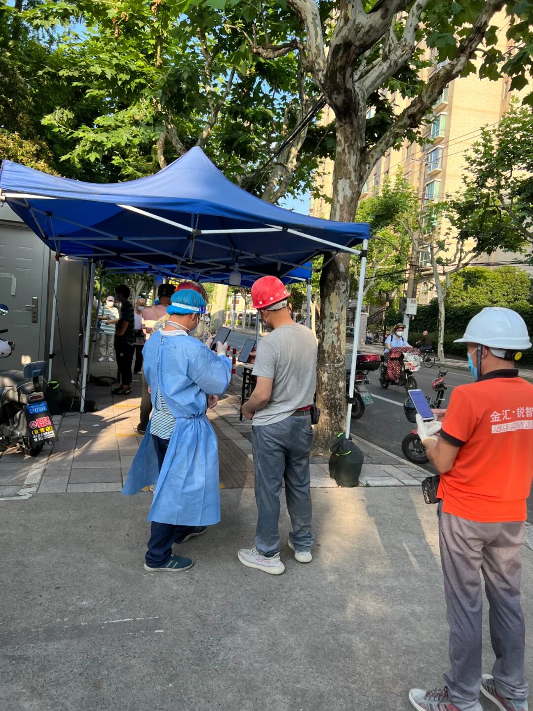 采样亭早十点开到晚十点,四个小时一班、每天三个班头,两名“大白”搭班两名“小蓝”。居民一提起扫码“小蓝”,马上想到的是他们顶着37度的太阳,站在采样亭外工作,十分辛苦。他们或站、或坐、或走,给前来做核酸的居民扫核酸码、区分单管混管队伍;火眼金睛发现并劝阻代做核酸的人;确保扫码不能出错,否则可能会被团长“追责”。