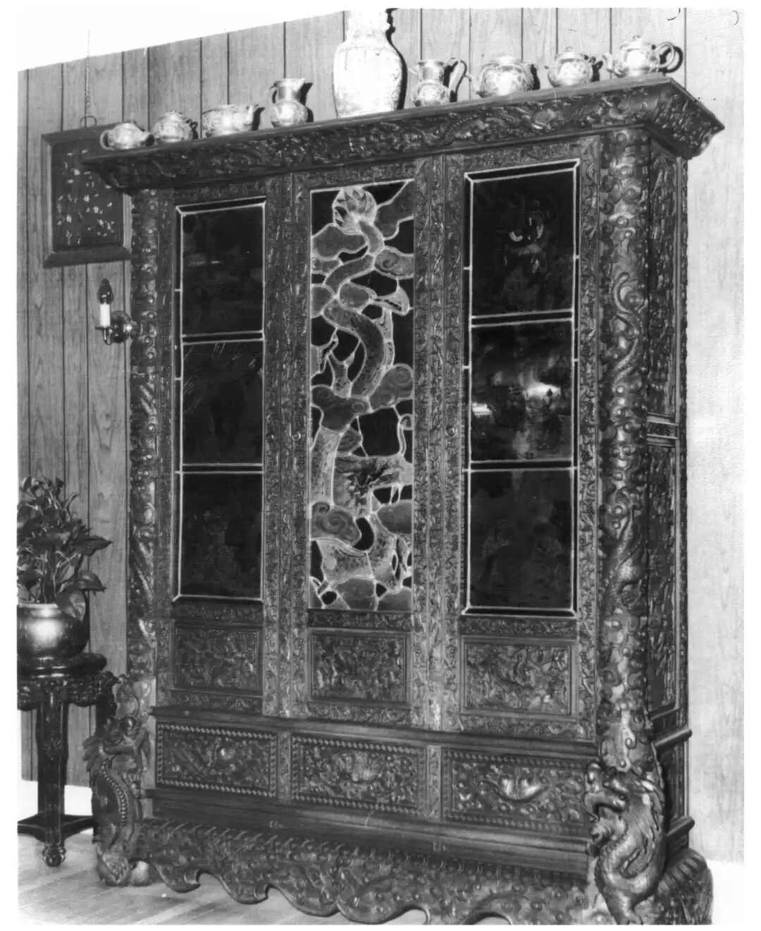 橱柜高约2.13米,宽1.52米,进深0.41米。整个橱柜除去七块彩绘玻璃外,全都布满雕刻。正面是左、中、右三扇镶嵌彩绘玻璃的橱门,中间橱门的彩绘玻璃上,镶嵌的是一条东方巨龙,而两侧橱门彩绘玻璃上描绘的都是中国传统历史故事。