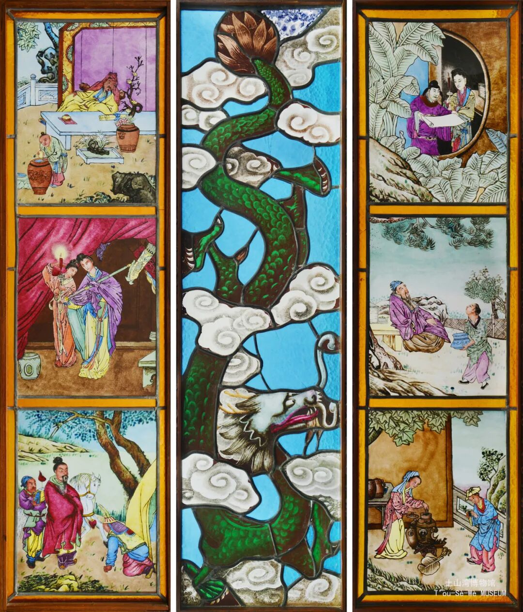 土山湾的彩绘玻璃能获得如此荣耀,“确实是恰如其分,名副其实”。宋浩杰介绍,橱柜左侧橱门三块彩绘玻璃的内容分别取自宋代“梅妻鹤子”典故中的“林逋赏梅”、《三国演义》中的“刘备招亲”和“七擒孟获”;右侧橱门三块彩绘玻璃的内容分别取自宋代“琴瑟和合”典故中的赵明诚和女词人李清照的爱情故事、东晋诗人陶渊明著名诗句“采菊东篱下,悠然见南山”中“渊明对菊”、西汉“文君当垆”典故中才女卓文君和司马相如私奔后的生活景象。