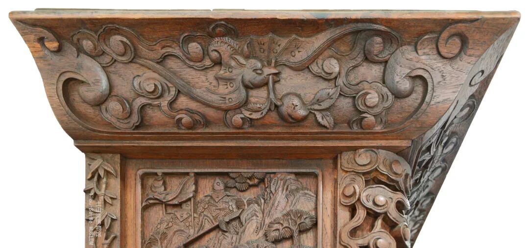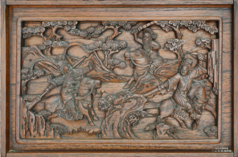 橱柜材质为红色柳桉木,中国传统历史故事内容的完整雕版共九块,正面三块,左右侧面各三块,雕刻工艺呈现出明显的江浙地区风格,也是流行的传统家具雕刻式样。九块木雕分别是《说岳全传》中的“岳云锤震金蝉子”、《隋唐演义》中的“魏文通九战秦琼”“御果园”“薛仁贵征东”“打登州”“美良川”、《封神演义》中的“辞师下山”、《西游记》中的“蟠桃会”等内容。