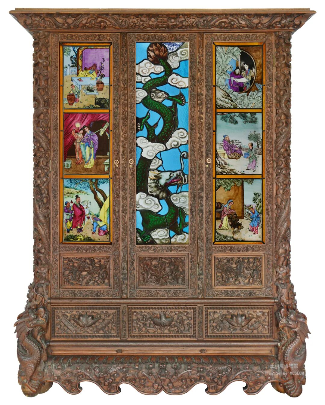 1912年,一件由土山湾孤儿工艺院制作,集彩绘玻璃和木工雕刻技艺于一体的土山湾彩绘玻璃雕花橱柜出炉,并在之后的1915年远渡重洋,参加了在美国旧金山举办的巴拿马太平洋博览会。此后近百年,她静静安身于海外藏家的居所。