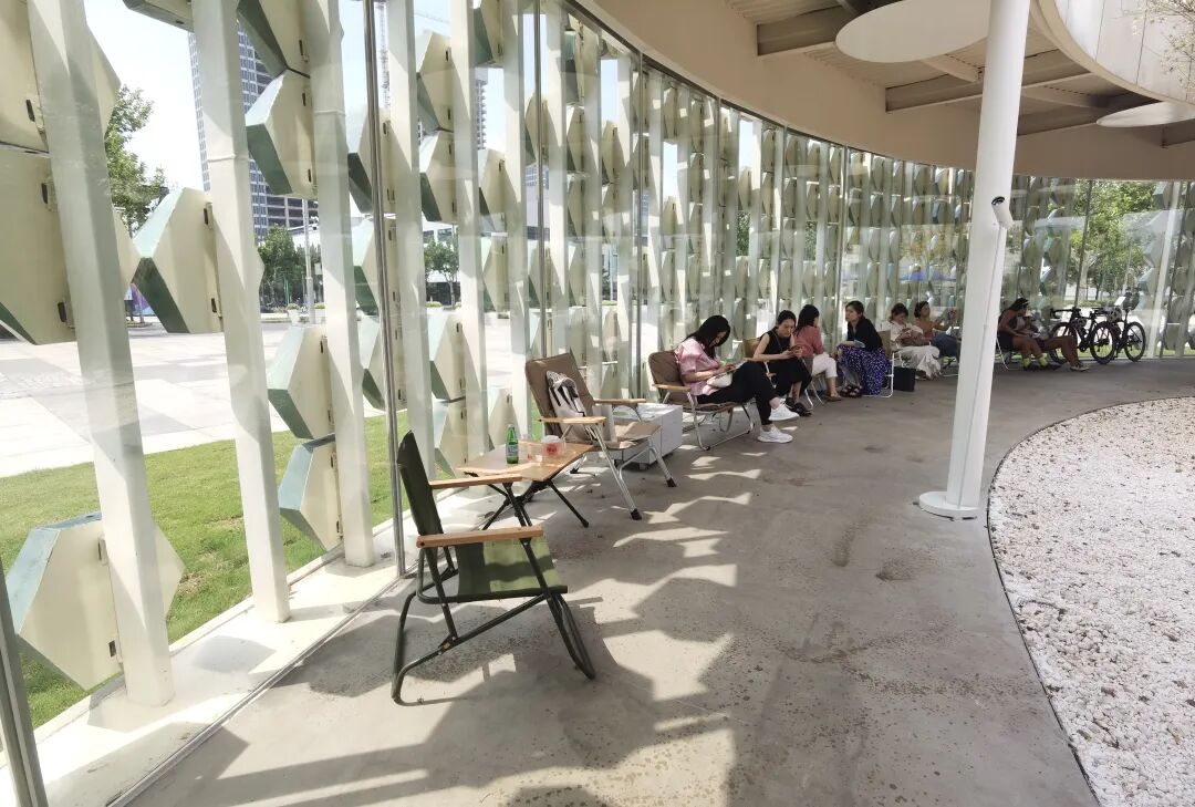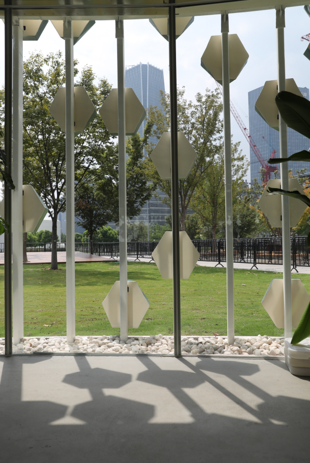 近日,西岸美术馆附近一家正在试营业的咖啡馆成为了新的网红打卡地。咖啡馆的建筑很有特色,环形空间以大片玻璃作为围墙,外面饰以松石绿的六边形石块。当下午的阳光穿过玻璃,就会在地面上落下疏密有致、极具几何感的阴影。