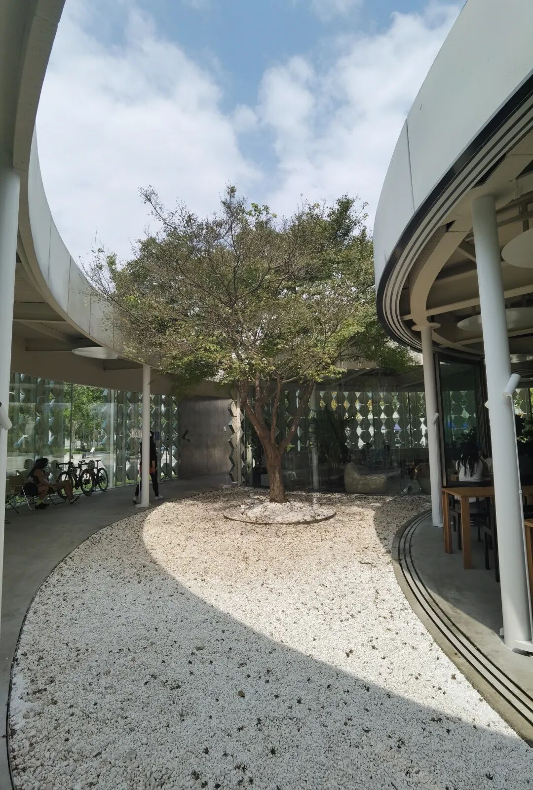 咖啡馆内部面积很大,设计也极具空间感。月牙形的天井中只有一颗枫树坐落于此,白霜一样的鹅卵石铺满一地,向上望去,蓝色的天幕衬托得尤为漂亮。