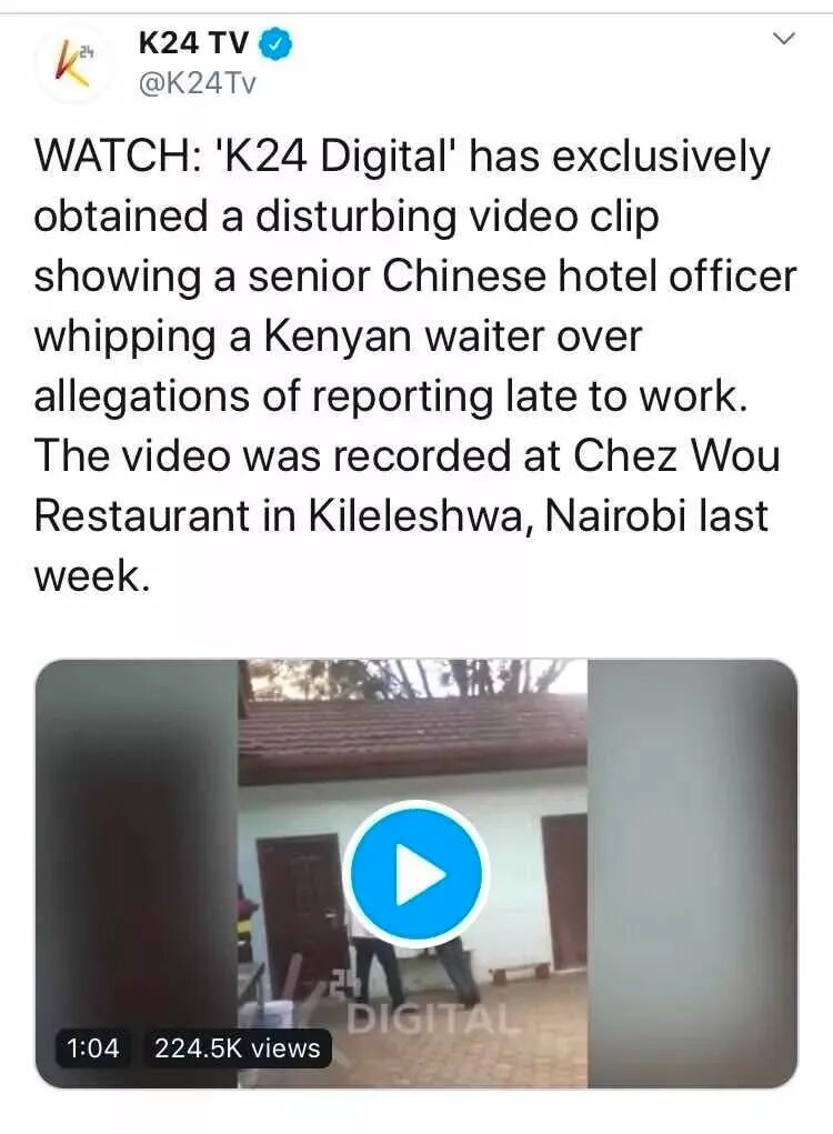 被拍摄下来放在社交媒体上传播的事件,在肯尼亚还有一例,一位年轻的中国老板,对着镜头辱骂当地人,出现猴子等字眼。。。也是被驱逐出境的下场。