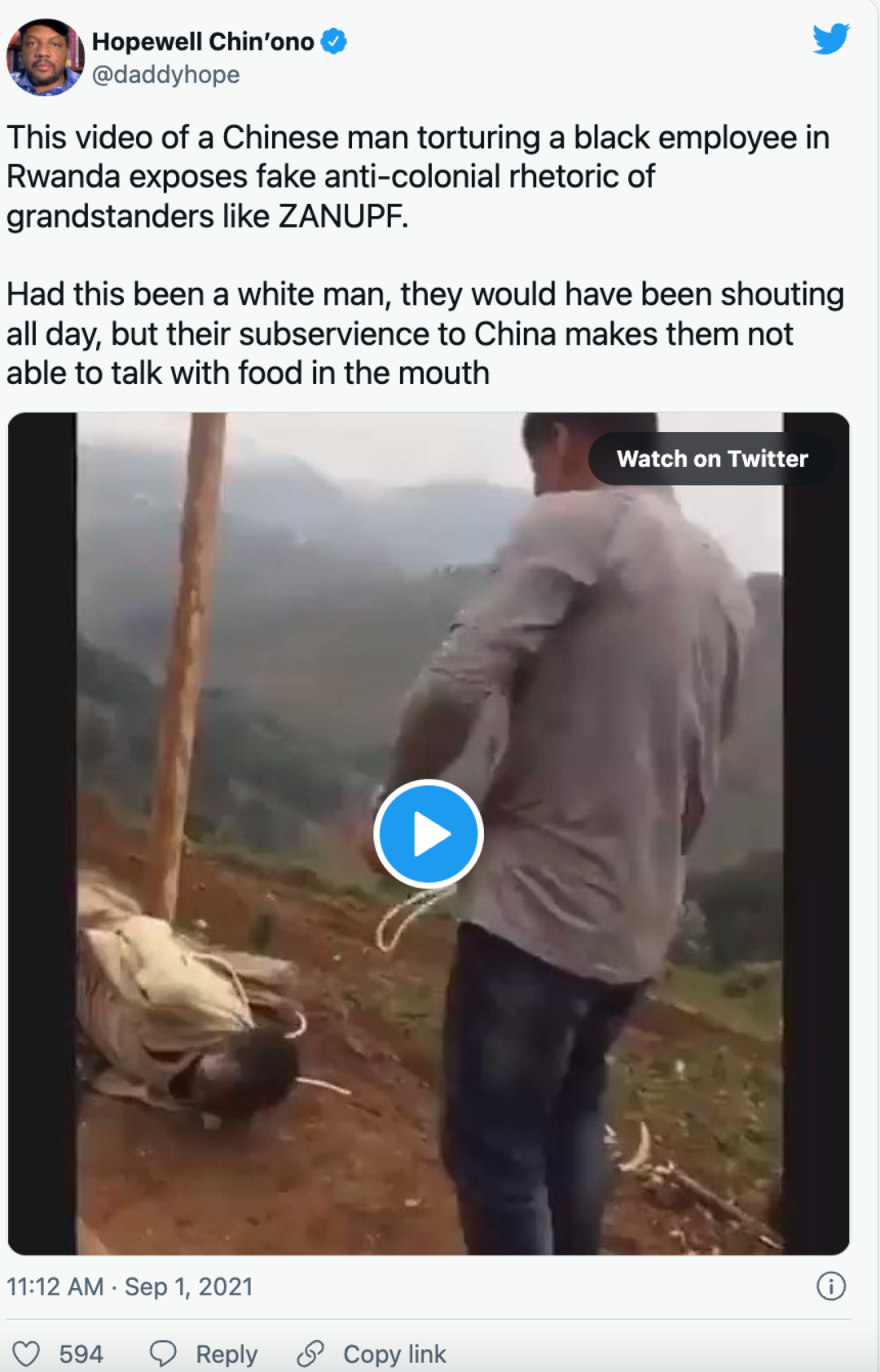 点开一看,大吃一惊!这名新闻里写的中国男子-Sun Shujun在卢旺达从事矿业开发,视频中被鞭打的是他认为“多次在矿上偷盗“的员工,而拍摄视频的应该也是他的员工或者围观者,这段视频于2021年8月被放上社交媒体,迅速发酵,并在很长一段时间被很多的大V转发。下方我截了其中的一个,这个博主在抬头上并未提及为什么这位中国人要鞭打本地员工,而是写了(大意如下):这段一名中国男人在卢旺达折磨一名黑人(本地)员工的视频,揭露了上位者虚假的反殖民言论,就像是ZANUPF(这里指的可能是津巴布韦非洲民族联盟-爱国阵线)如果这是个白人,他们会整天喊叫,但是他们对中国人屈从,因为他们的嘴巴都被塞满了食物,没办法说话了。(大意是讽刺当局吃人嘴短,而对中国人“殖民”的不作为)这篇具有强烈对抗情绪的推文在卢旺达以及周边国家引起大规模的传播,在社交媒体评论区出现的主要言论都是:中国在殖民非洲,中国人在殖民非洲,为什么其他卢旺达人不反抗?我们怎么能允许这样的事情在非洲的土地上发生?等等非常激烈的评论,但是没有人去问一句,为什么这件事情会发生?情绪的引导完全被引向了“殖民”。甚至有评论说,都21世纪了,我们还要像黑奴时代一样,被当成奴隶一样的鞭打吗?我非常的理解所有的评论,这件事情,确实是中国的这位Sun先生做错了,我们现在身在别人的国家,首先应该做到的就是遵守当地的法律法规。如果你认为对方有偷盗行为,那可以报到警察局,私刑不管在哪个国家都是犯法的行为。不知道为什么这位Sun先生会选择私刑,而不是到当地警察局报案,据我自己10多次长时间停留卢旺达的个人经验来看,卢旺达政府和警察还是非常保护投资者的,也会认真的执法。选择这样公开鞭打(让人围观)不知道是什么用意?这不仅是犯法,还是一种非常愚蠢的管理方式。2022年4月19日,卢旺达法院以酷刑罪判处Sun先生20 年有期徒刑,一名据称是他雇员的卢旺达男子也因教唆酷刑被判处 12 年监禁。这样的判决说实话,有些出乎我的意料,量刑真的过高了,诚然,Sun先生绝对是犯法了,应该获得相应的刑罚,这是毋庸置疑的,但是这么高的刑罚,难免有向舆论压力妥协的嫌疑。从不同的媒体了解到,Sun先生曾经有向被害人做出赔偿(差不多折合1338美元)和解,并且和被害人签署了“和解信”,但是最后当事人和法庭对“和解信”并不承认,称被害人签署“和解信”是因为恐惧和害怕Sun。类似的案例在非洲华人身上已经不是第一次发生了,比如不久之前2020年2月在肯尼亚就曾经发生过中餐馆的中国人厨师“鞭打“餐馆肯尼亚服务员的事件,被当地人(大面上是其他员工)拍摄下来,放到社交网站上,也是引起巨大的舆论风波,最后涉案人员不仅被拘留,还要求赔偿受害人,最后被驱逐出境。