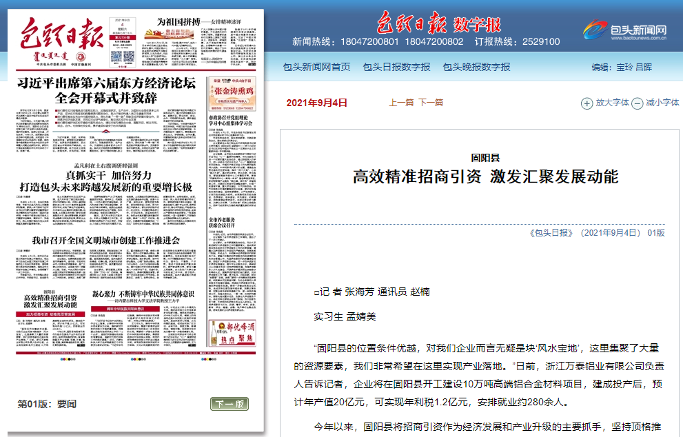 “固阳县的位置条件优越,对我们企业而言无疑是块‘风水宝地’,这里集聚了大量的资源要素,我们非常希望在这里实现产业落地。”日前,浙江万泰铝业有限公司负责人告诉记者,企业将在固阳县开工建设10万吨高端铝合金材料项目,建成投产后,预计年产值20亿元,可实现年利税1.2亿元,安排就业约280余人。9月4日,《包头日报》头版,对此进行了报道。
