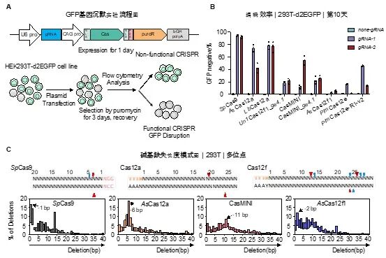 图一. 通过EGFP沉默实验和PEM-seq技术评估微型Cas12核酸酶的编辑能力。A. 不同CRISPR-Cas系统在HEK293T-d2EGFP细胞系的编辑效率检测流程图。B. 在指定靶位点不同Cas酶的GFP基因破坏效率。C. 不同CRISPR-Cas系统编辑产生的碱基缺失长度的模式图。