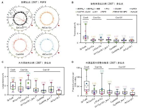 位点所产生的脱靶位点的数目与分布。B-D. 不同Cas酶在基因编辑中所产生的染色体易位事件(B),染色体大片段缺失(C),外源DNA片段插入(D)的比例。