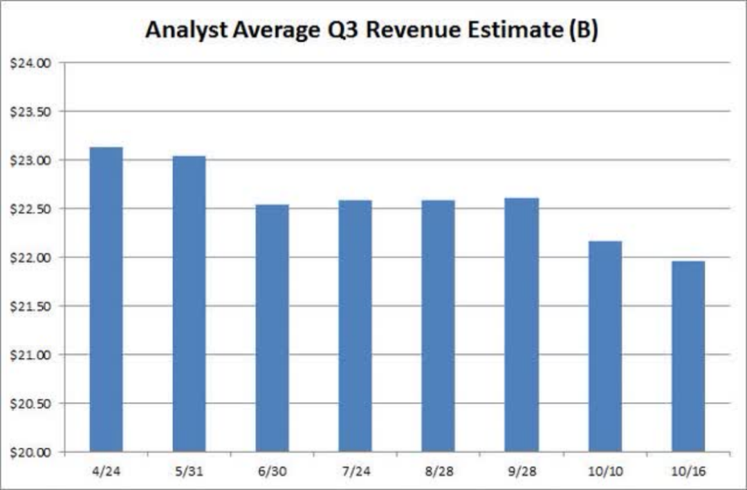 在今年四月底达到231.5亿的营收峰值,从第三季度开始营收预期就一直在下降。目前的平均交付量为219.6亿美元,其中包括低于183亿美元的最低预期,这使得平均交付量略低。