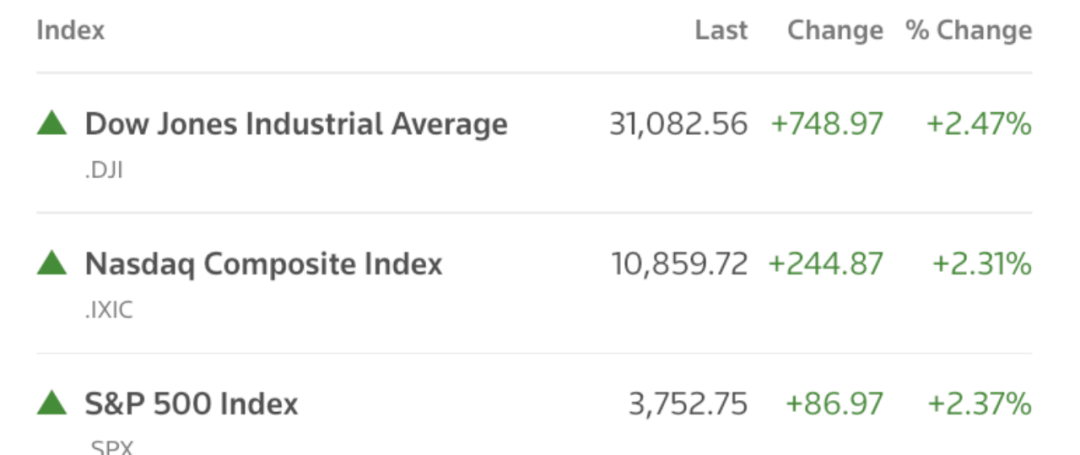 截至收盘,道指收盘上涨748.97点,涨幅为2.47%,报31082.56点;纳指涨244.87点,涨幅为2.31%,报10859.72点;标普500指数涨86.97点,涨幅为2.37%,报3752.75点。