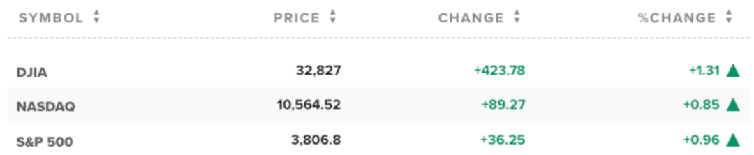 截至收盘,道指涨423.78点,涨幅为1.31%,报32827.00点;纳指涨89.27点,涨幅为0.85%,报10564.52点;标普500指数涨36.25点,涨幅为0.96%,报3806.80点。