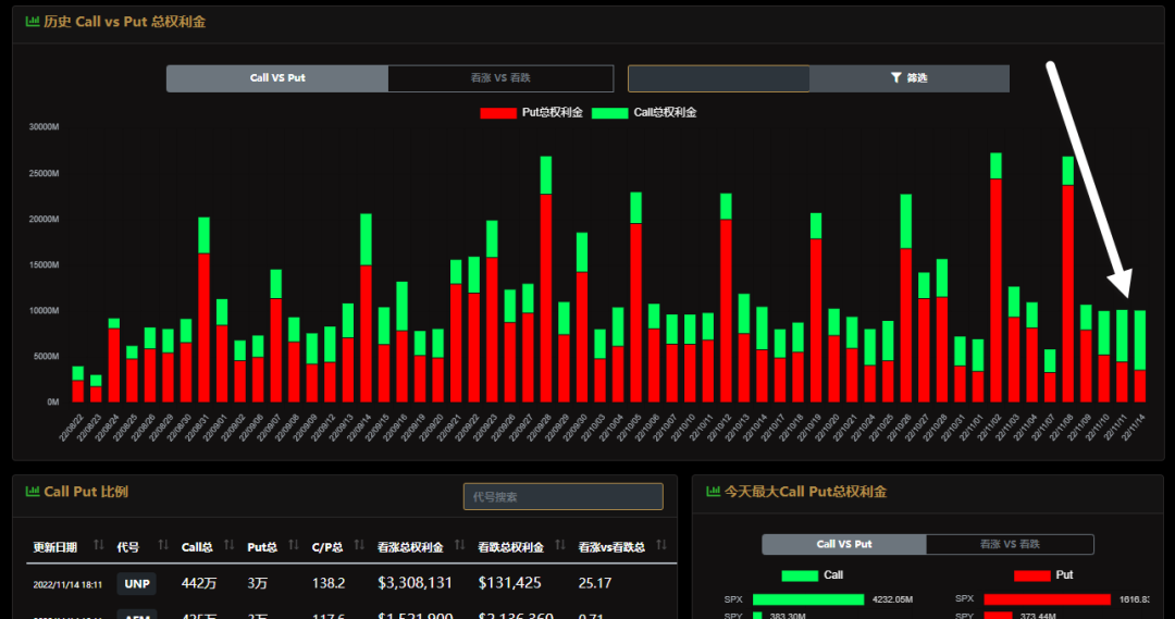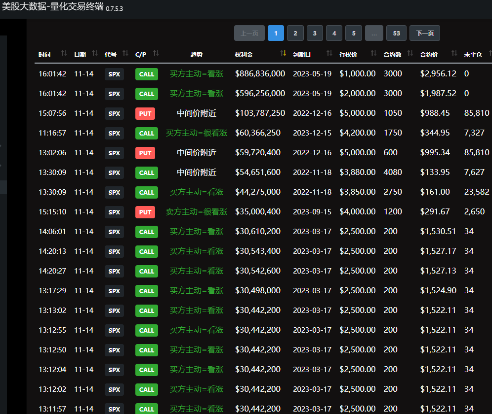 就是今天在整个期权交易市场里面,整个Call的总权利金比Put总权利金多出将1倍,这是在最近几个月以来的首次,意味着什么,意味着有点熊转牛的信号出现。我们打开单个的期权大单来细看,我们会发现排在最大的总权利金都是一片绿色的买入开仓标普指数SPX 的看涨期权。金额都在上千亿美元。