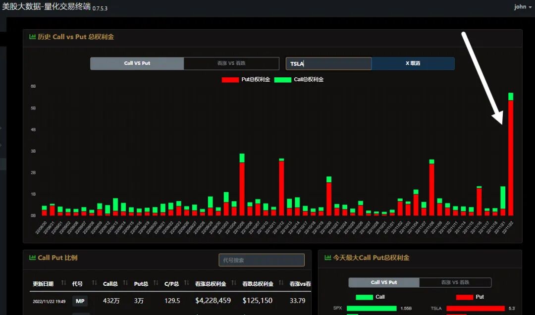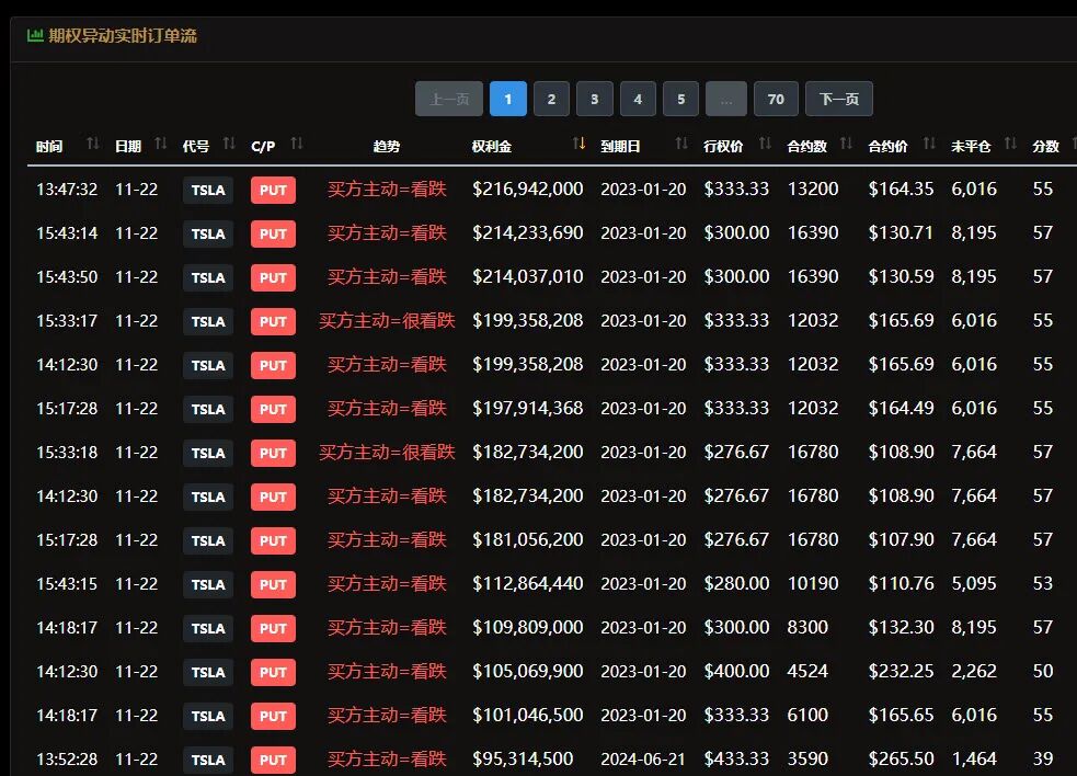 此外今天我们在美股大数据量化交易终端StockWe上发现特斯拉看跌期权出现异常的多
