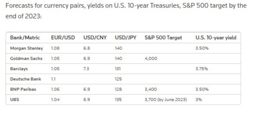 各大投行对2023年货币汇率、美国10年期国债收益率、标普500指数的预测如下:
