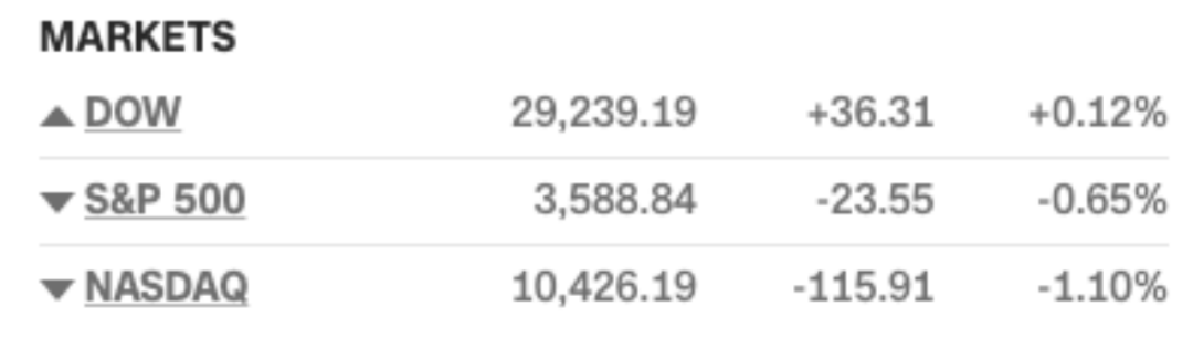 美股周二涨跌不一,标普500指数下跌0.65%,未能守住盘中反弹后的涨幅;纳指下跌1.1%,创两年来新低,导致其重返熊市,即较近期高点下跌20%或更多;道指,收涨0.12%。