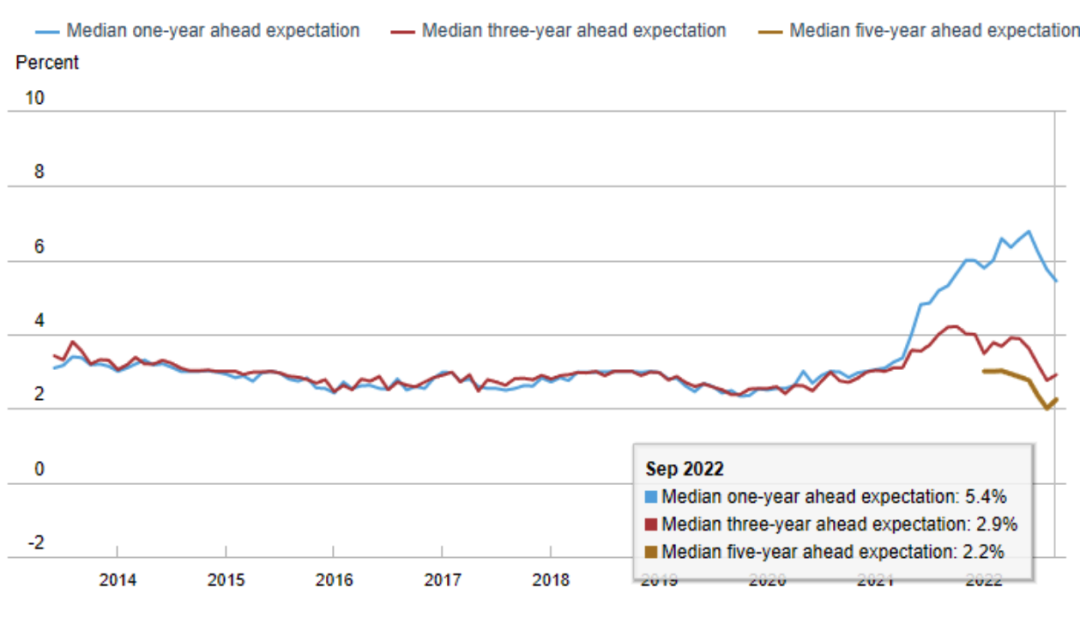 周二,纽约联储微观经济数据中心发布了9月的消费者预期调查(SCE)。数据显示,受访者对未来一年通货膨胀率的预期中值为5.4%,较上月走低了0.3个百分点,录得去年9月以来的最低水平。