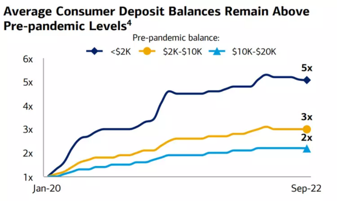 与支出一样,消费者的储蓄数据也很不错。莫伊尼汉称消费者的账户余额仍高于疫情前水平,意味着很有可能会继续花钱。特别是那些疫情前银行账户余额最少(低于2000美元)的群体,他们目前的账户余额达到疫情前的5倍。