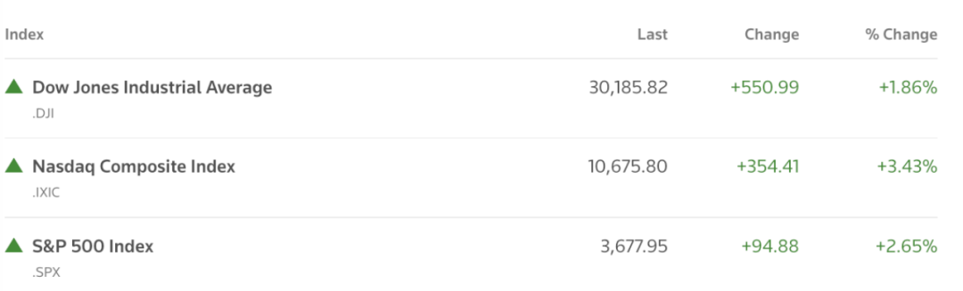 截至收盘,道指涨550.99点,涨幅为1.86%,报30185.82点;纳指涨354.41点,涨幅为3.43%,报10675.80点;标普500指数涨94.88点,涨幅为2.65%,报3677.95点。