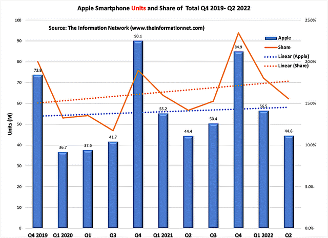 不过全球的智能手机的出货量最近停滞了,这与疫情的反复,高通胀以及经济衰退和裁员潮息息相关。消费者会考虑自己的生活成本。但是在过去11个季度里,苹果在全球智能手机市场的份额有所增加。我们可以通过这条橙色虚线趋势线显示的积极出货量看出来。虽然此次iPhone的销售略低于预期,增速接近10%。