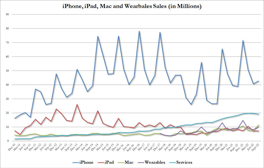 4. Mac电脑和可穿戴设备及配件的收入猛增、远超预期,而iPad平板的收入超预期下降,较二季度加速下滑,服务业务的收入增长远不及预期,并且较二季度增长明显放缓。