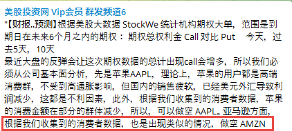 除了看交易数据,我们还购买了美国消费者的数据一起分析,发现,亚马逊的销售出现大减,我们也在VIP社群提示,做空亚马逊和苹果,期权群买亚马逊的末日和11月的Put,估计明天翻4-5倍。