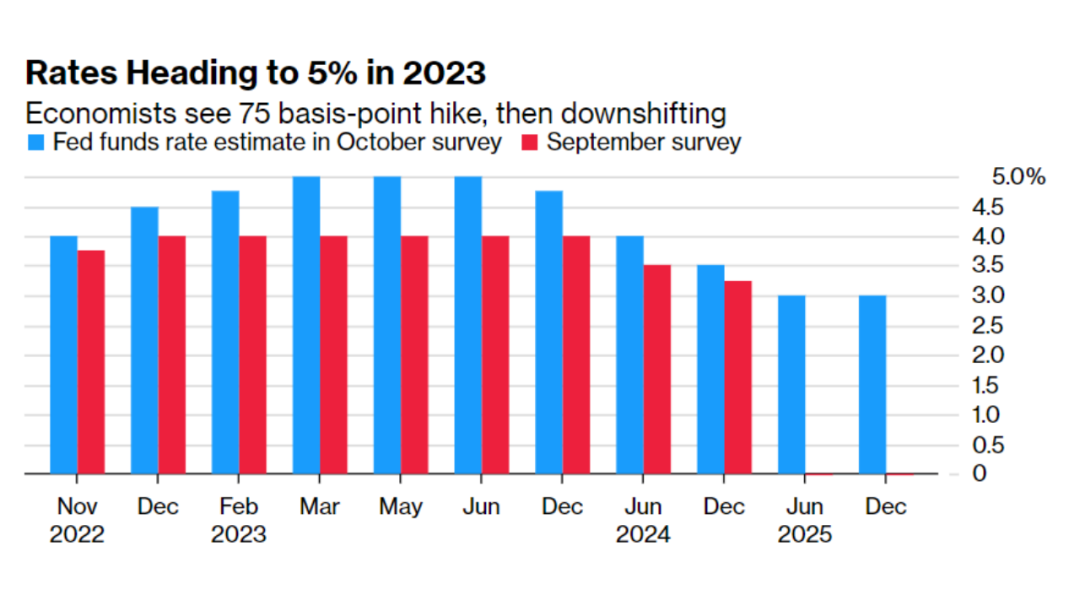 许多经济学家表示,美联储预计下周将保持其鹰派立场,连续第四次加息75个基点,为到2023年3月加息至5%的利率峰值奠定基础。美联储在9月会议上发布的预测显示,在2024年降息之前,今年联邦基金利率将达到4.4%,明年将达到4.6%。