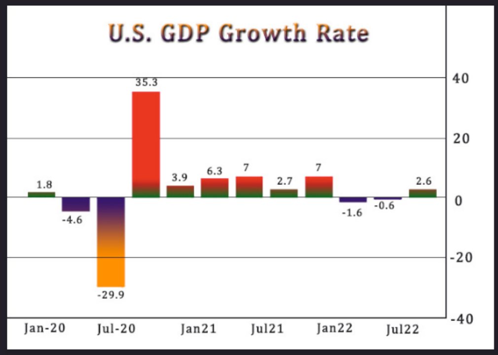 美国商务部周四公布,第三季度国内生产总值(GDP)经通胀因素调整后环比折合年率增长2.6%,这是继今年前两个季度下降后出现反弹,并且好于经济学家们所预期的2.3%的增幅。这反映了出口、消费者支出、非住宅固定投资、联邦政府支出以及州和地方政府支出的增长,但部分被住宅固定投资和私人库存投资的下滑所抵消。