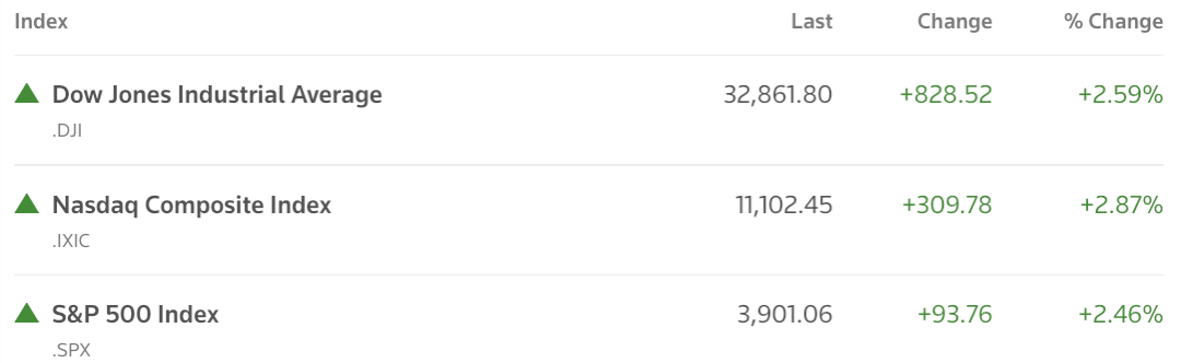 周五美股收涨,市场正在评估亚马逊等科技股财报。截至收盘。道指收于32,861.80点,上涨828.52点,涨幅约2.6%。标普500上涨近2.5%,收于3,901.06点。纳指收于11,102.45点,上涨约2.9%。