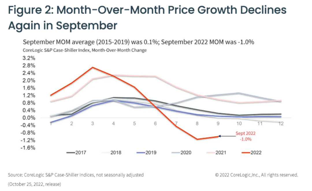 由于更高的利率使买家更加谨慎,美国9月份的房屋价格环比下滑。周二,标普CoreLogic Case-Shiller全国房价指数数据显示,美国9月份房价较8月份下跌1%,连续第三个月下跌。