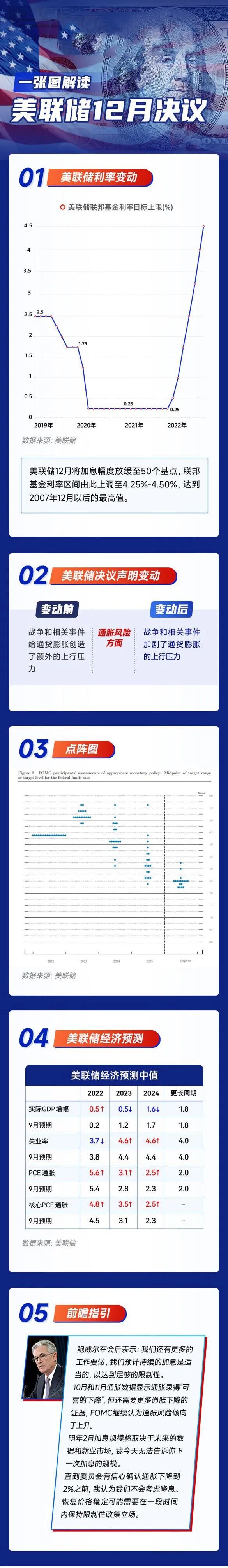2、直到 2024 年才会降息。点阵图被进一步抬高,预期的“终端利率”,即官员们预计结束加息的点,被定为 5.1%。比 9 月份预测的 4.6% 水平高出50个基点.此外预计 2024 年利率将降至 4.1%,也略高于此前的预期。这是推动美股盘中跳水的直接原因!