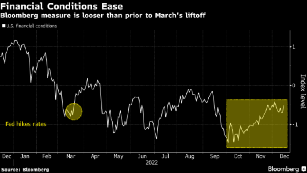 自从11月2日会议以来,标普500指数截至本周二上涨近7%,是2020年6月以来最佳两次会议期间表现。高盛的一个美国金融状况指数下跌0.8%,是2009年8月以来最大两次会议期间降幅。