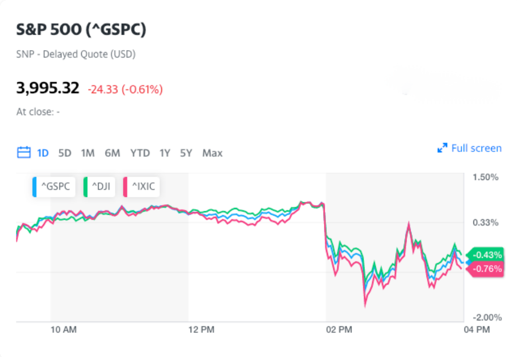 截至收盘,标普500指数下跌0.61%,回吐了稍早0.9%的涨幅。道指下跌0.42%,纳指下跌0.76%。