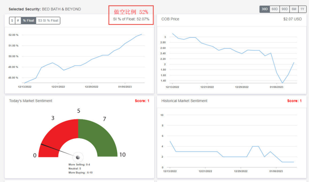 我们买入的原因是 :根据 美股大数据 “ BBBY因为经营不善面临破产的零售商,被机构大量做空,卖空者在2022年获利1.79亿美元,Short Interest 做空比例竟高达 52%,正处于大规模的逼空行情,意思就是空头被迫买入回补“。