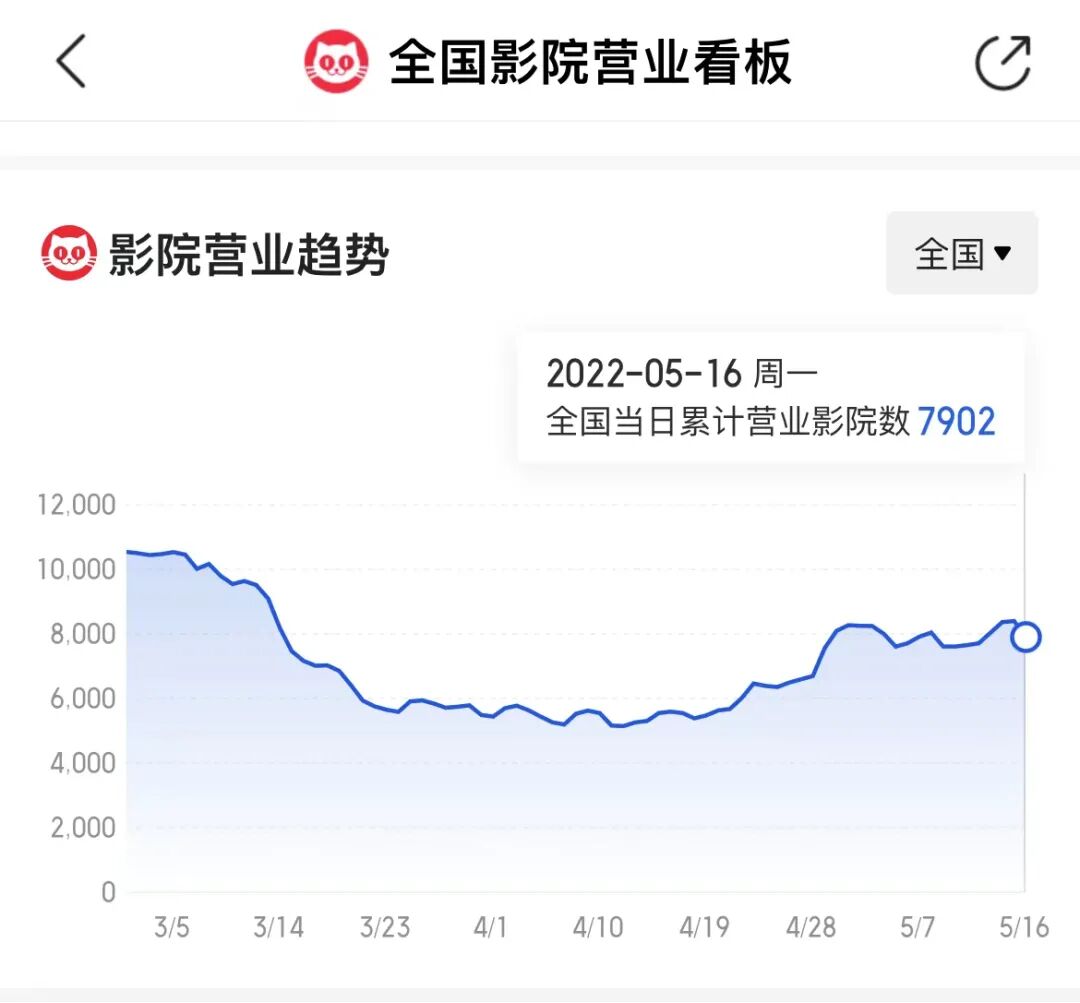 受到疫情的持续影响,从3月底到4月中下旬,内地影院的营业率一度跌至不足50%。