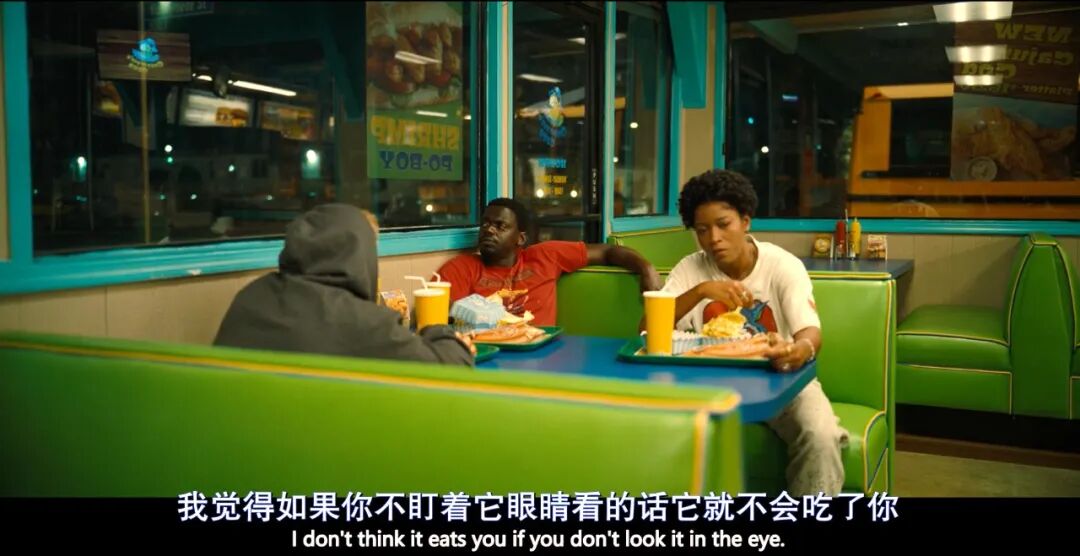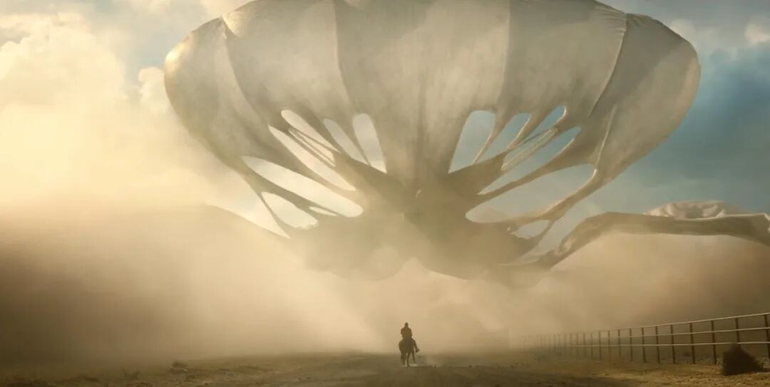 一类是在被好莱坞电影工业培养的,对特效大片的迷恋。从当年斯皮尔伯格的《大白鲨》《侏罗纪公园》,到如今漫威DC用炫目特效堆砌的超英大片,观众的口味被养得越来越刁钻。没错,《不》同样贡献了好几个足够酷炫、气势恢宏的大全景镜头,以满足观众对于“奇观”的渴望。还有一类,是被手机和社交网络培养的,对猎奇流量的迷恋。很多人都曾有刷抖音几小时,完全停不下来的上瘾感,因为动动手指,下划就能看到下一个“奇观”。片中拼死靠近拍摄的摄影师,还有追逐猎奇新闻的八卦记者,最终都被不明生物吞噬,这便是“娱乐至死”的代价。影片中,男主角OJ发现了战胜大气生物的关键秘密,那就是“不要和它直视”。OJ的爱马在片场失控踢人,因为它在镜子中意外看到自己的影子。小朱普从发疯的猩猩身边逃过一劫,是因为他面前恰好遮挡了桌布,所以没有直视猩猩的眼睛。对发怒的动物或人来说,这种对视意味着挑衅,通俗点说,就是“你瞅啥”?如果延伸一些理解,这是他们对于“观看”和“凝视”的强烈反抗。