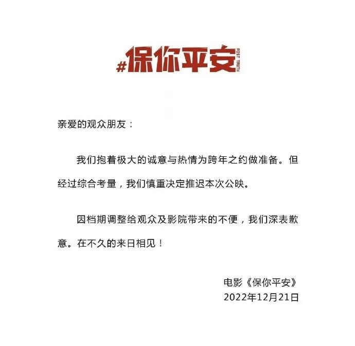 本片定于12月23日提前点映,12月24日正式上映,同时发布“回忆播放”版海报。大鹏导演新片《保你平安》作为开幕片亮相海南国际电影节,原本已经宣布开启点映。12月21日,原定于计划于12月31日全国上映的本片宣布推迟公映。电影《航海王:红发歌姬》宣布将延长上映至2023年1月14日,本片于12月1日上映,截止目前累计票房已超1.5亿,观影人次破400万次。中国知名编剧倪震逝世,享年84岁。倪震是中国电影理论学者及编剧,任教于北京电影学院,曾担任多位第五代导演的老师。倪震生前著有《探索的银幕》《改革与中国电影》及《北京电影学院物语——第五代电影前史》(日文版)等多部研究作品。他曾根据苏童的小说《妻妾成群》改编《大红灯笼高高挂》电影剧本,也曾参与《红粉》《鸦片战争》等片的剧本创作。