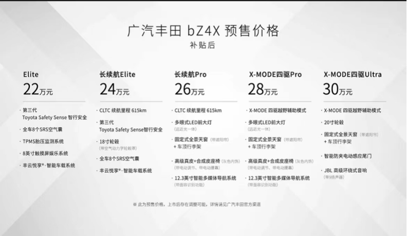 4月28日,丰田bZ系列的首款纯电动SUV-bZ4X开启预售,预售价格区间为22-30万元,其将在一汽丰田汽车销售有限公司、广汽丰田汽车有限公司进行销售。新车基于丰田EV专用平台“e-TNGA”打造,提供单电机前驱版和四驱版本两种选择!