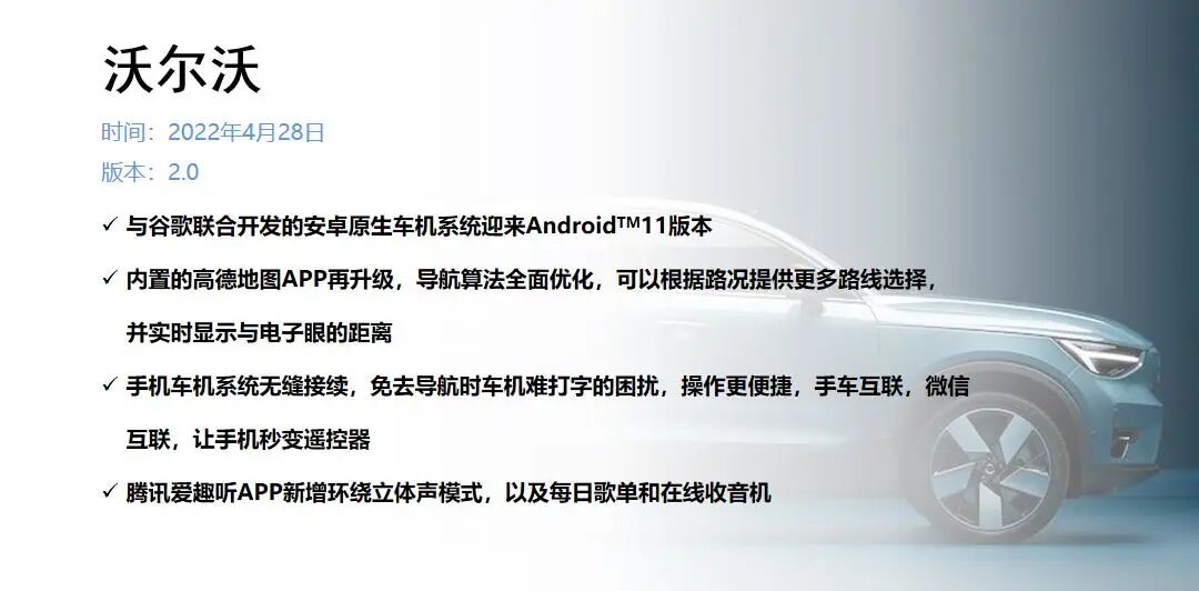 沃尔沃4月份宣布2022年起全系新车将实现OTA功能,在中国市场,已经搭载全新沃尔沃智能互联系统的车型可通过此次在线远程升级更新至2.0版本。