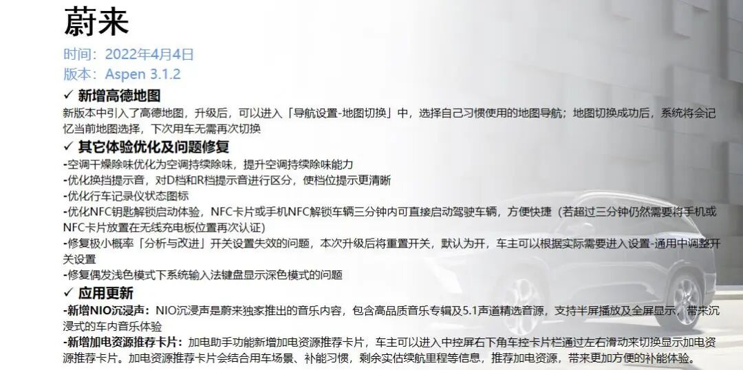 4月份,蔚来通过FOTA分批对当前版本为3.0.7及以上的车辆,推送了Aspen 3.1.2版本的更新,主要涉及导航地图升级以及其它体验提升等。