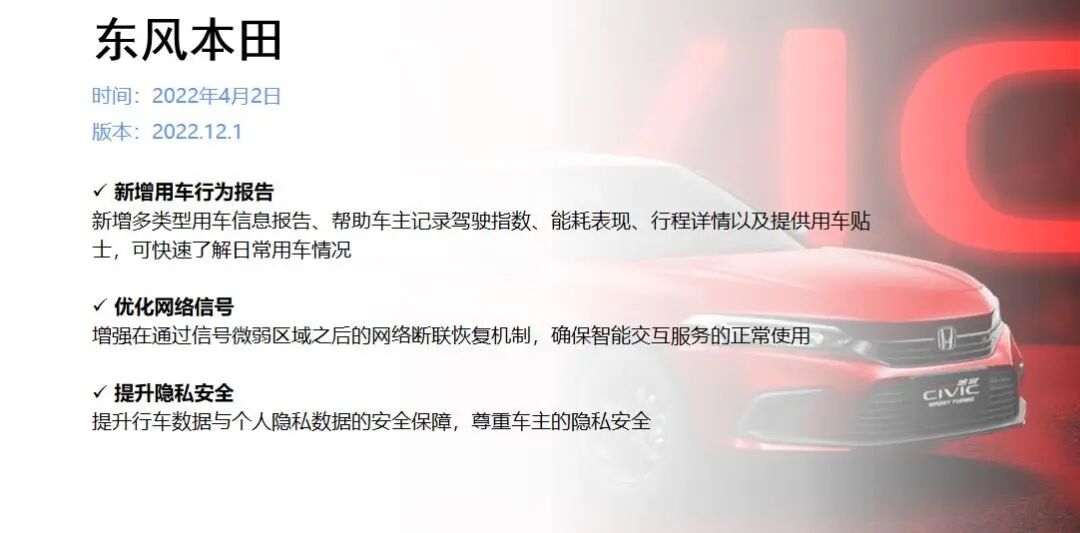 4月初,东风本田对已搭载Honda CONNECT3.0(智导互联)系统的车型进行了OTA升级,具体包括第十一代思域、英仕派、全新艾力绅、新款享域。