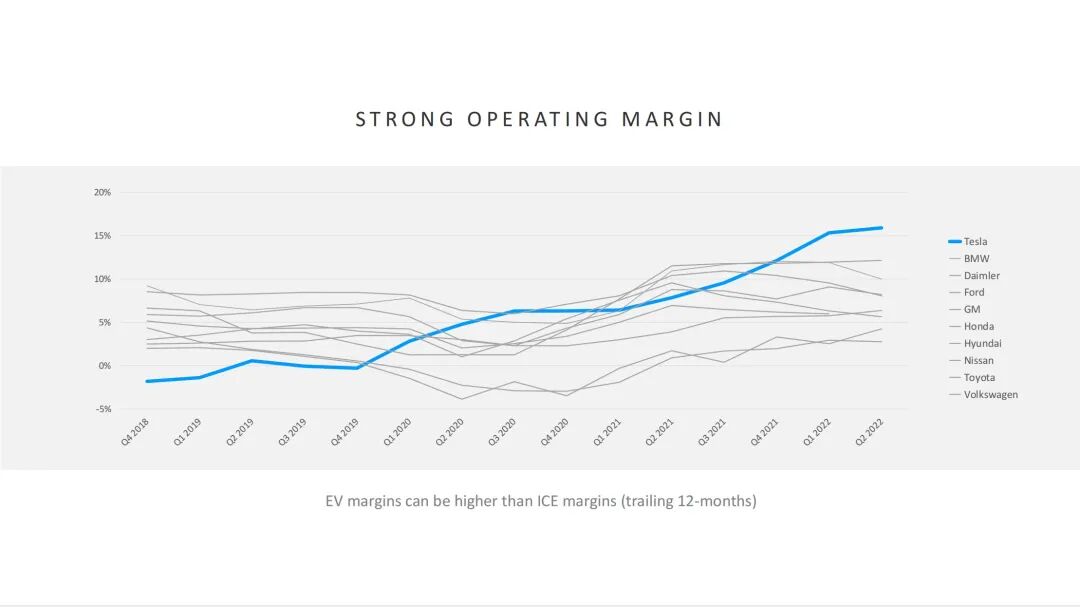 但特斯拉已在业绩表现的某些关键部分实现反超,其营业利润率在今年第二季度超过15%,是所有大型汽车制造商中表现最好的一个,即使号称为赚钱机器的奔驰和宝马,也难望其项背。