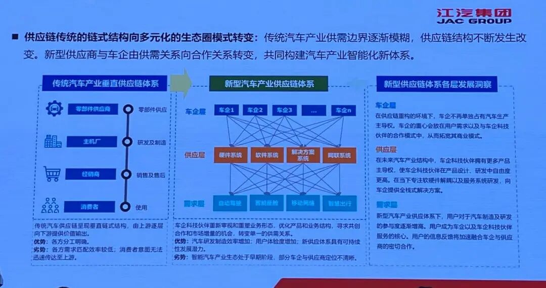 “传统汽车产业供需便捷逐渐模糊,供应链结构不断发生改变。新型供应商与车企由供需关系向合作关系转变,共同构建汽车产业智能化新体系”,安徽江淮汽车集团股份有限公司采购中心副总经理戚军如是说。
