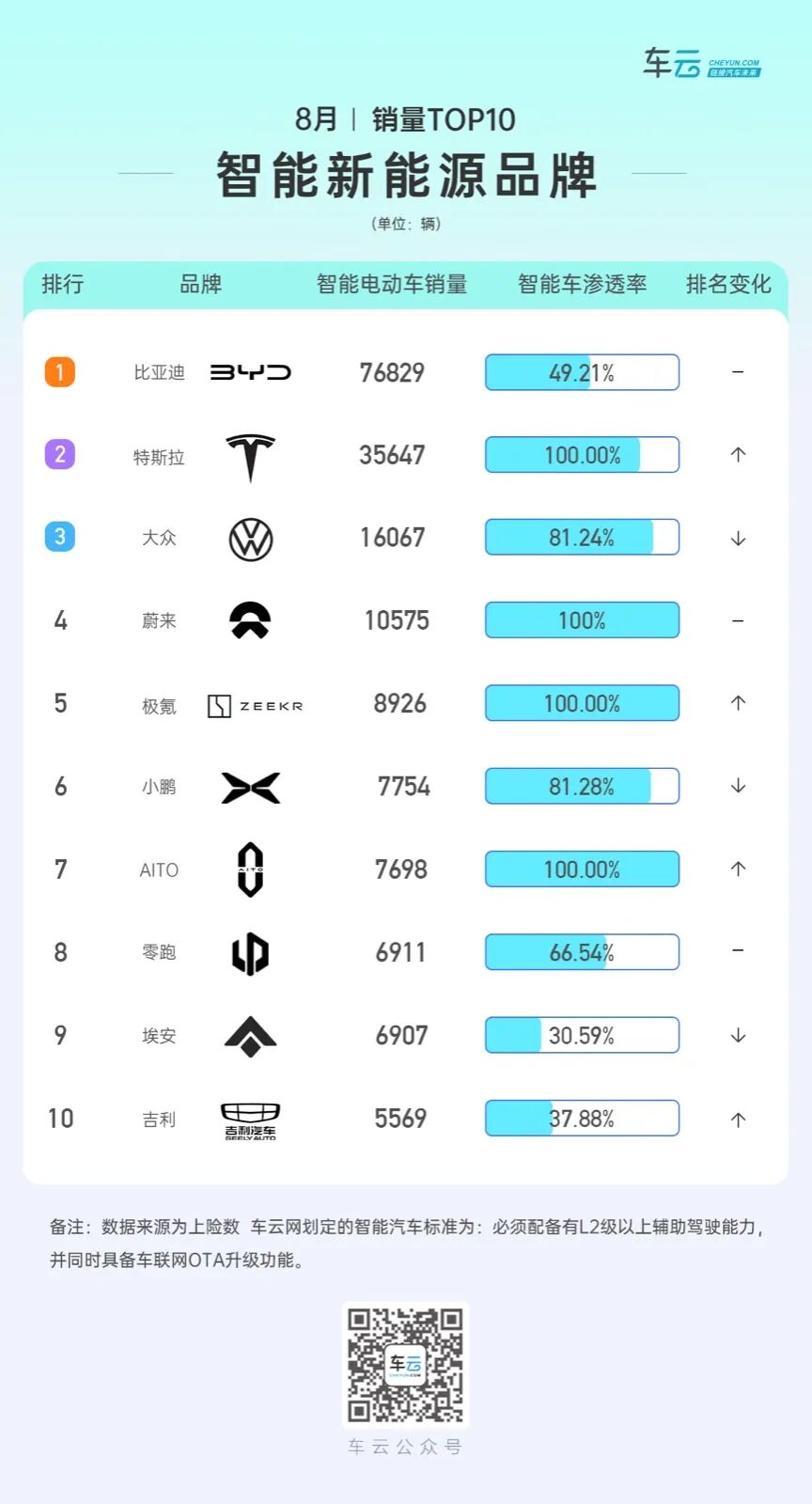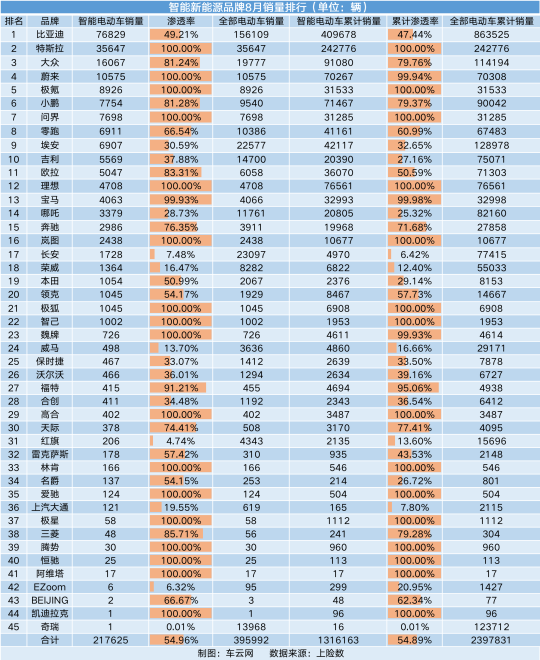 整体来看,8月智能新能源汽车的总销量为21.76万辆,占所有新能源汽车销量的45.14%;1~8月,智能新能源汽车的累计销量则为131.62万辆,在所有新能源汽车中的占比为43.45%。