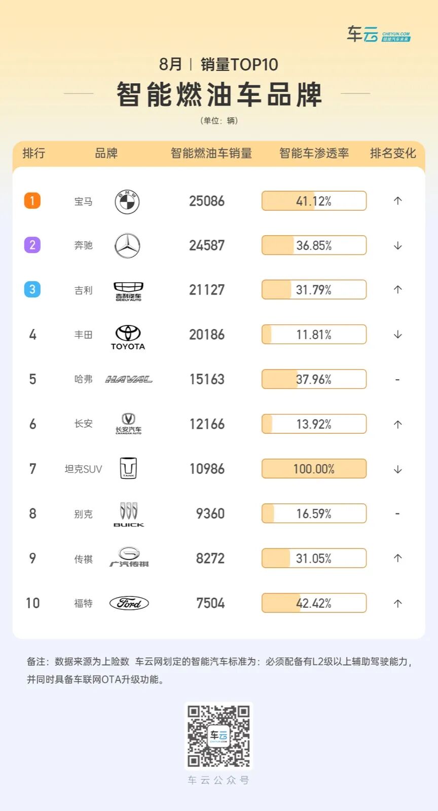 品牌方面,宝马和梅赛德斯-奔驰仍占据前2名,其中宝马以超过41%的智能化渗透率反超奔驰位居第一,奔驰的智能汽车渗透率为36.85%,以2.46万辆的智能燃油汽车销量成绩位居第二。