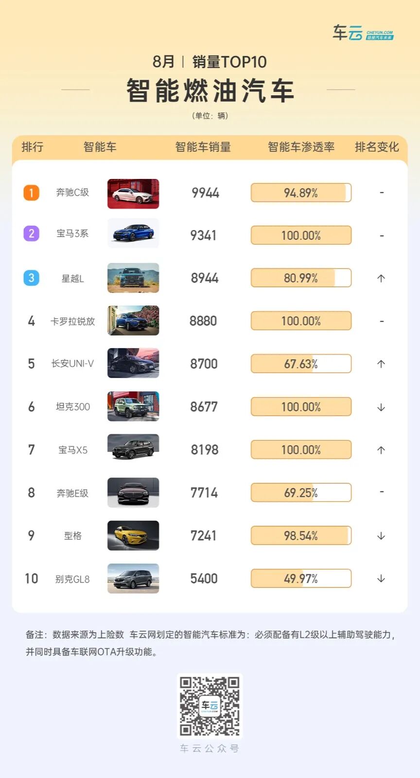 车型方面,具有鲜明智能化特色的燃油车在浩浩燃油车大海中所占的比例极少。车云统计的具备强智能化属性且市场表现不俗的十大燃油车如下:奔驰C级、宝马3系、坦克300、卡罗拉锐放、星越L、型格、长安UNI-V、奔驰E级、别克GL8、宝马X5。