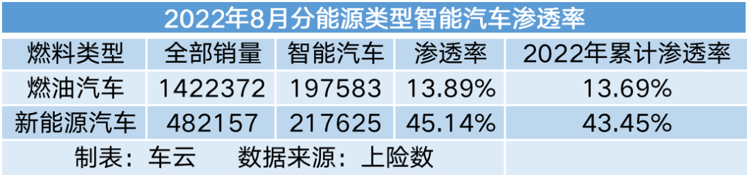 不过,燃油汽车的智能化渗透率要大幅落后于新能源汽车。根据车云统计,8月新能源汽车的智能化渗透率为45.14%,今年累计渗透率也高达43.45%。而燃油汽车的智能化渗透率在8月只有13.89%,今年以来的累计渗透率也只有区区的13.69%。