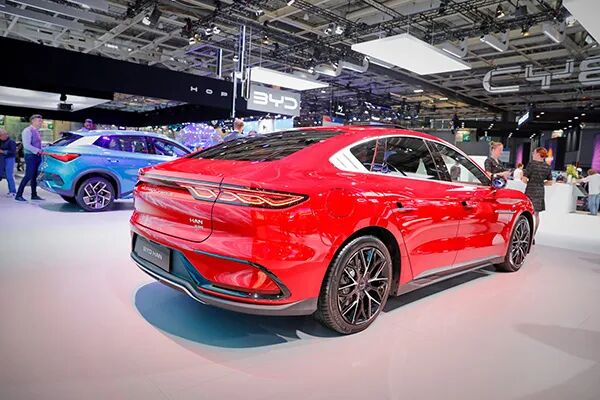 一同亮相的比亚迪汉欧洲版采用了国内现款汉创世版的外观,我们可以看到车头不再是“汉”,而是BYD的英文Logo,车尾的中文名称也变成了“HAN”,以及3.9S和EV的标识。同时,车内也将国内的钢琴烤漆材料换为了Alcantara材质,因此不少外媒也将比亚迪汉视为一台极具运动感的轿车。